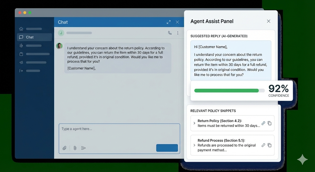 Agent assist is one of the most rewarding AI use cases. It works while a human is talking. It suggests next steps. It drafts replies. It surfaces policy snippets.