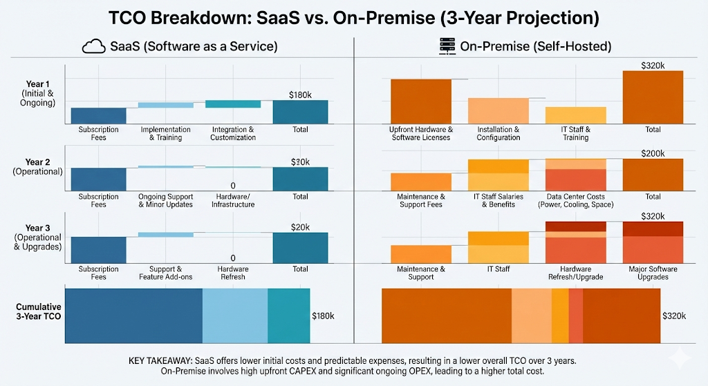 TCO is not just licensing. It includes people, downtime, audits, integrations, security tooling, backup, disaster recovery, and ongoing improvement. SaaS can reduce infrastructure operations. On-premise can reduce certain recurring fees, but it increases operational workload.