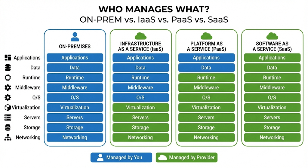 IaaS gives you raw infrastructure. Think virtual machines, storage, and networks. You still manage many layers.